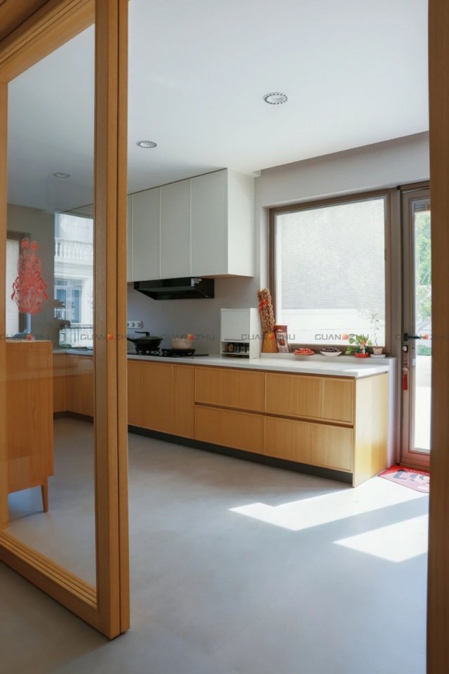 微水泥纹理、柔和光感、木色橱柜融合搭配,现代又温馨。而且冠珠岩板超耐污、易清洁,哪怕做饭手忙脚乱,轻轻一擦又是“新厨房”!