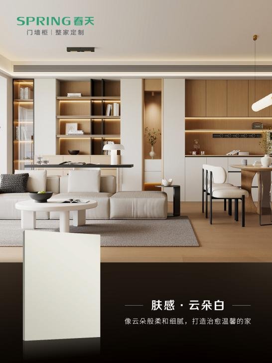 春天高能PET饰面云朵白肤感,比纯白更柔和,比米白更纯粹,它散发温润柔和的气质。无论是用于卧室的衣柜,还是客厅的收纳柜,它都能轻松营造出温馨、舒适的氛围,让家真正成为一个安心休憩的治愈港湾。