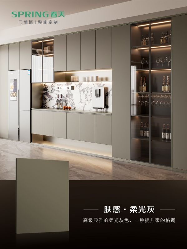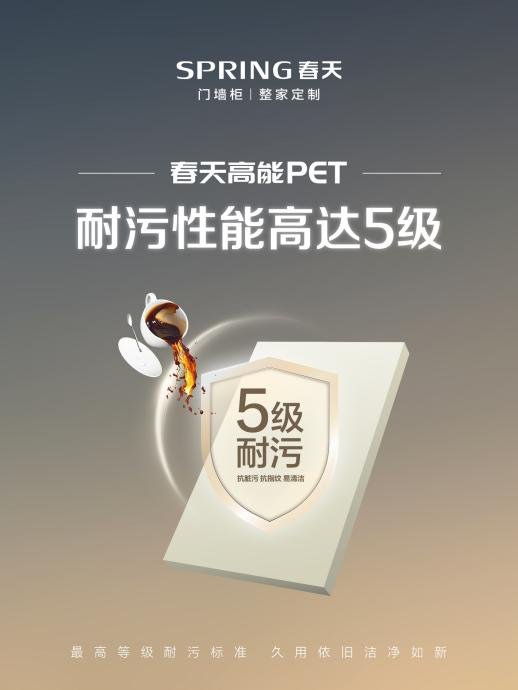 对于厨房这类重油重烟的空间,春天高能PET饰面高达5级的抗污性能(最高等级耐污标准)。酱油、醋、油渍等污渍只需轻松一擦即可去除,抗脏污、易清洁、抗指纹的特性,让日常打理变得前所未有的简单。