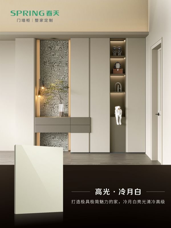 如同夜空中倾泻而下的一抹月光,春天高能PET饰面冷月白高光自带一种清冷的气质。它纯净、透亮,能瞬间提升空间的通透感与高级感。选择它来打造全屋柜体,仿佛为家注入了极简主义的灵魂,营造出一个克制却又不失温度的生活场域。