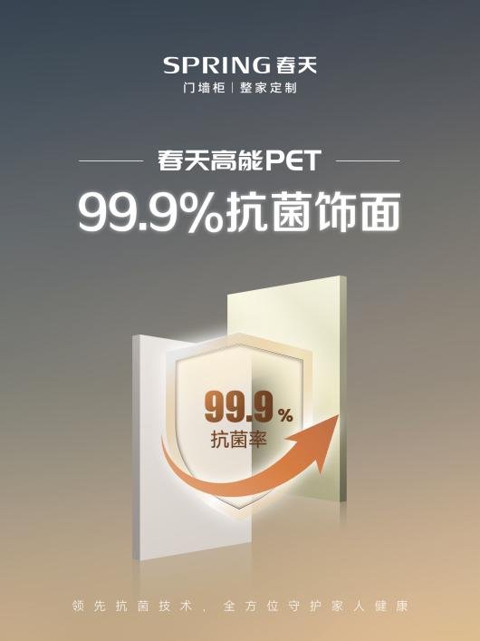 春天高能PET饰面采用领先的抗菌技术,饰面抗菌率高达99.9%,能有效抑制大肠杆菌、金黄色葡萄球菌等常见细菌的生成。这为有婴儿、孕妇、老人的家庭提供了全方位的健康守护,让家的每一寸空间都安心无忧。