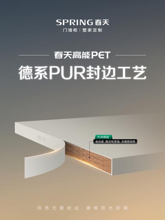 春天高能PET饰面采用先进的德系PUR封边工艺,实现与板材的同色无缝封边,让柜体视觉整体性更强,PUR胶形成的不可逆粘贴层,剥离强度高达20kg以上,硬核防水防潮。同时,不含溶剂和甲醛,无毒无味,从源头业主居家健康。
