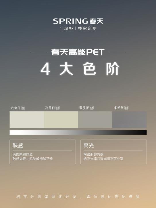 春天高能PET饰面肤感系列则摒弃了耀眼的光泽,选择以柔和的哑光质感拥抱生活。它触感细腻温润,如婴儿肌肤般顺滑,又如云朵般柔软,极大地降低了冰冷感,带来被温柔包裹的治愈体验。