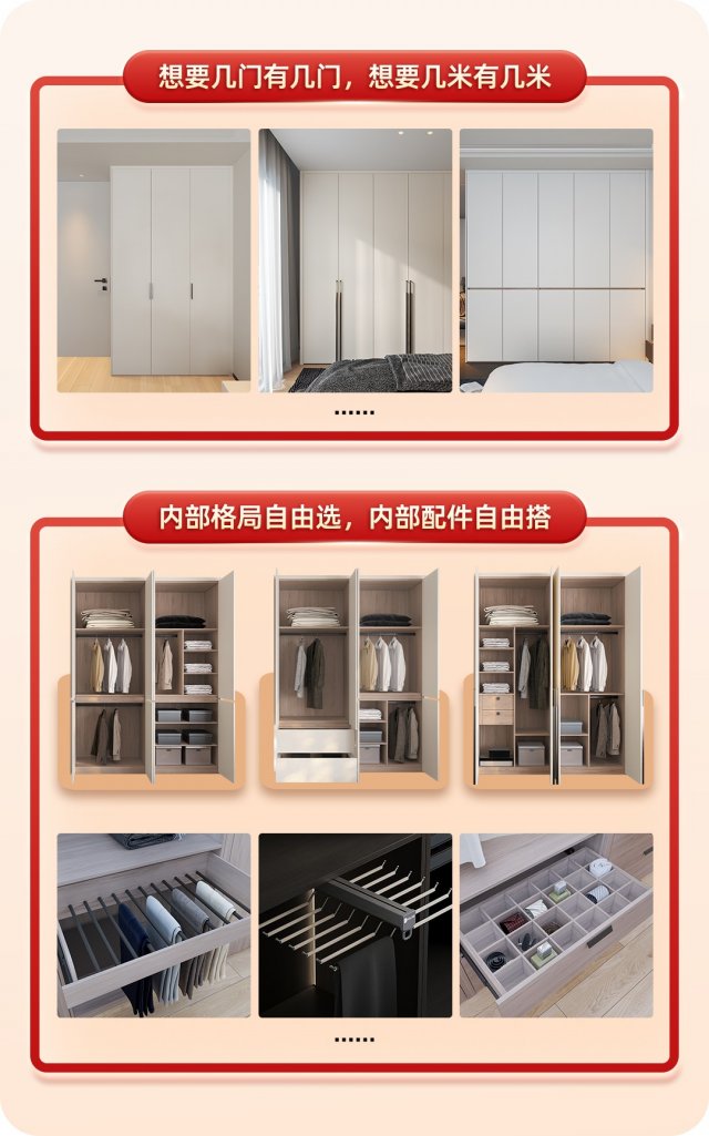 好莱客·莱住轻定制衣柜支持内部组件自由搭配,兼容多种收纳需求,搭配收边条实现严丝合缝,真正实现“零容错自助式定制”。