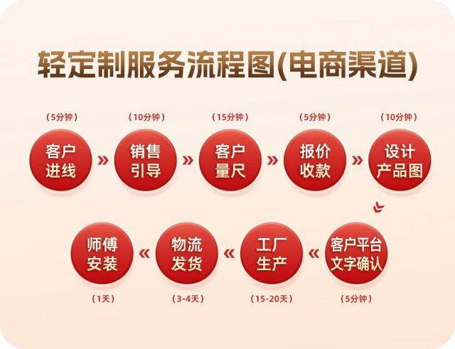好莱客于2025年7月正式推出轻定制模式,将其定义为:极致的流程优化,缩短销售流程,具备单品零售价且能够B2C销售的板式柜类商品。实现「极致流程+短周期+透明化」的家居定制新模式。相比好莱客线下定制(专车服务)高端定制服务,轻定制(特惠快车)只满足家居定制的产品需求,让单件家具也能轻松完成私人定制。