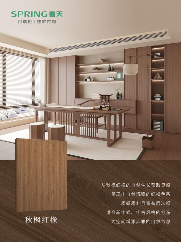 秋枫红橡:灵感源自秋枫红橡的自然生长,呈现出沉稳雅致的红褐色系。质感质朴且富有层次感。特别适合新中式、中古风格的空间打造,能为家居增添一抹典雅的自然气息,让空间在传统韵味中透出宁静与从容。