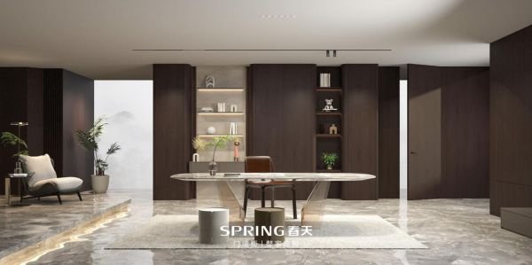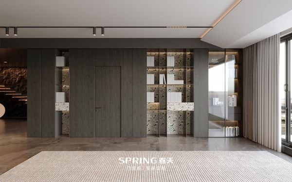 赤霞木:打造现代极简空间,浓厚的深棕色让空间更显沉静与内敛。隐形门设计一门到顶,将门完美隐藏于墙面之中,使空间更显流畅统一。书房采用开放柜与封闭柜间隔的设计,打破了柜体的沉闷感,发光金属层板的点缀让极简空间也不失精致。