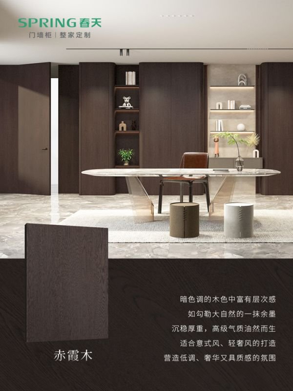 赤霞木:暗色调的木色中蕴藏着丰富的层次感,像大自然勾勒出的一抹余墨,沉稳厚重,高级气质油然而生。适配意式风、轻奢风,能营造出低调、奢华又极具质感的空间氛围,彰显居者对高品质生活的追求。