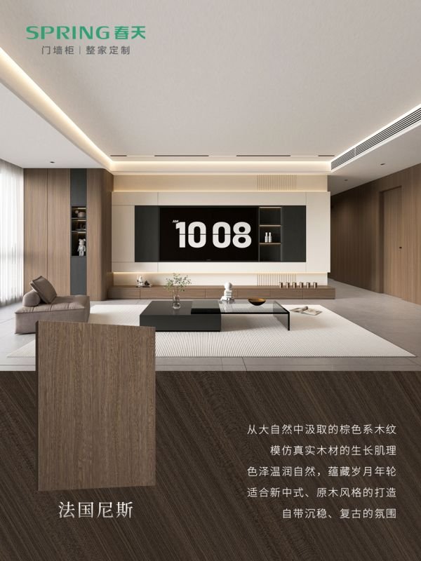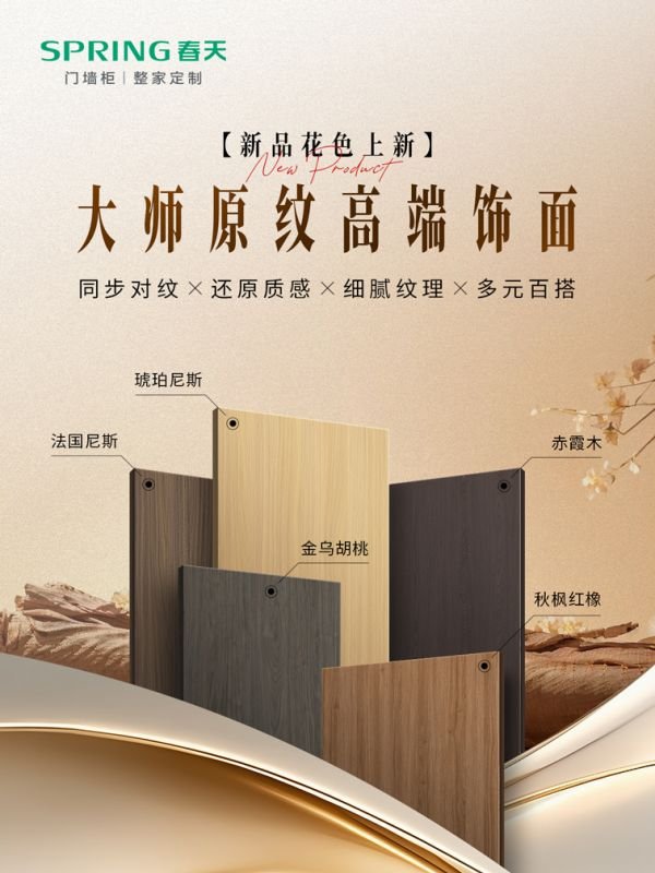近日,春天整家定制重磅推出 5 款 “大师原纹高端饰面”,以精准同步对纹钢板技术,完美还原真实木纹的天然质感,为家居空间注入自然与高端的双重魅力,为消费者提供更高颜值、更高品质的整家360健康人居解决方案。