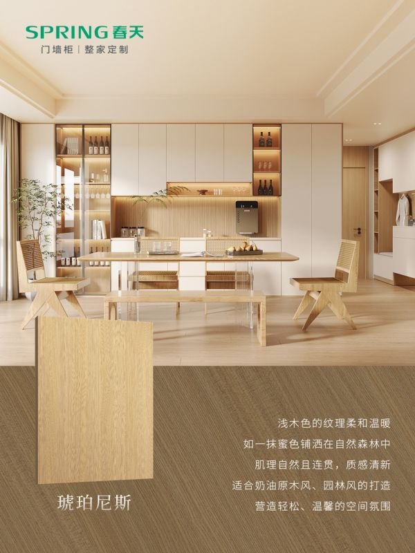 琥珀尼斯:浅木色的纹理柔和温暖,宛如一抹蜜色悄然铺洒在自然森林间。肌理自然且连贯,质感清新明快,为空间注入阳光般的暖意。适配奶油原木风、园林风等风格,轻松营造出轻松、温馨的居家氛围,让每一个角落都充满生活的惬意。