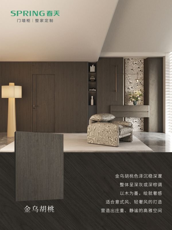 金乌胡桃:色泽沉稳深邃,整体以深灰调为主,犹如以木为墨,在空间中勾勒出浓郁的奢感。它是意式风、轻奢风的理想之选,能营造出庄重、静谧的高雅空间,让居者在低调中感受生活的精致。