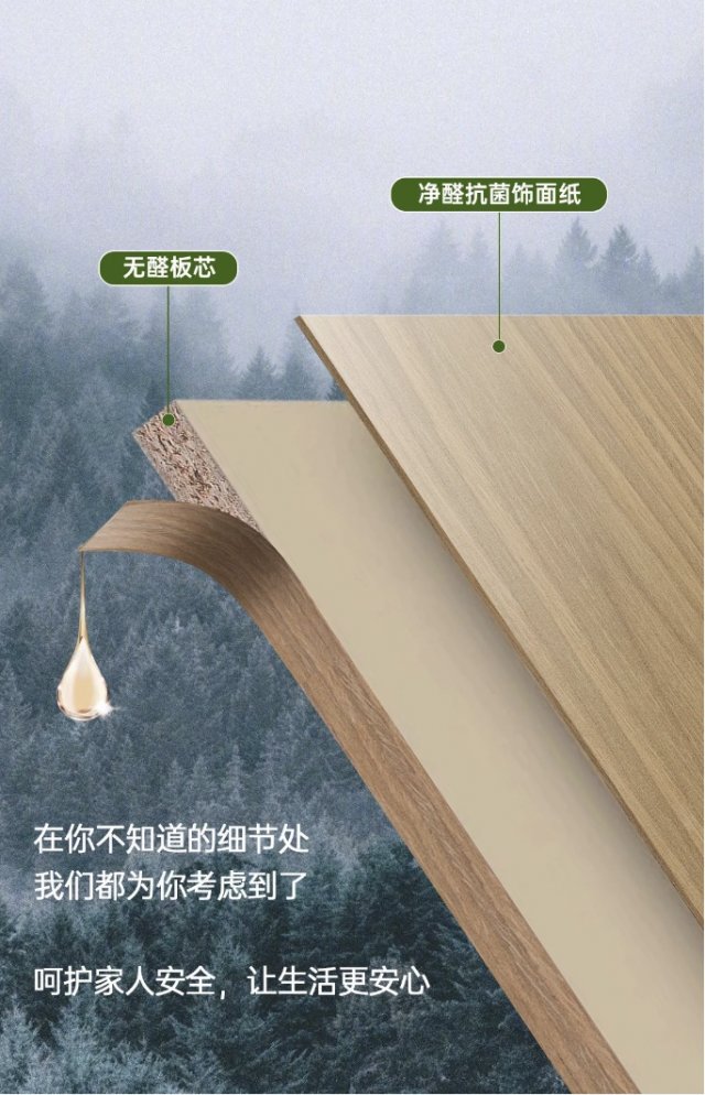 同时,太子家居在全屋整装上早早地就推出了无醛添加的安醛板。这种板材甲醛释放量为≤0.025mg/m³,达到国家ENF级环保标准。去年,升级后的安醛板3.0在板材表面再加一层纳米硅钛涂覆材料的饰面板,既有净醛抗菌功能又能起到吸附并分解空气中游离甲醛的作用,能够解决室内甲醛叠加污染的问题。可以说,选择太子家居这样的全屋整装公司,就是选择了一份放心。