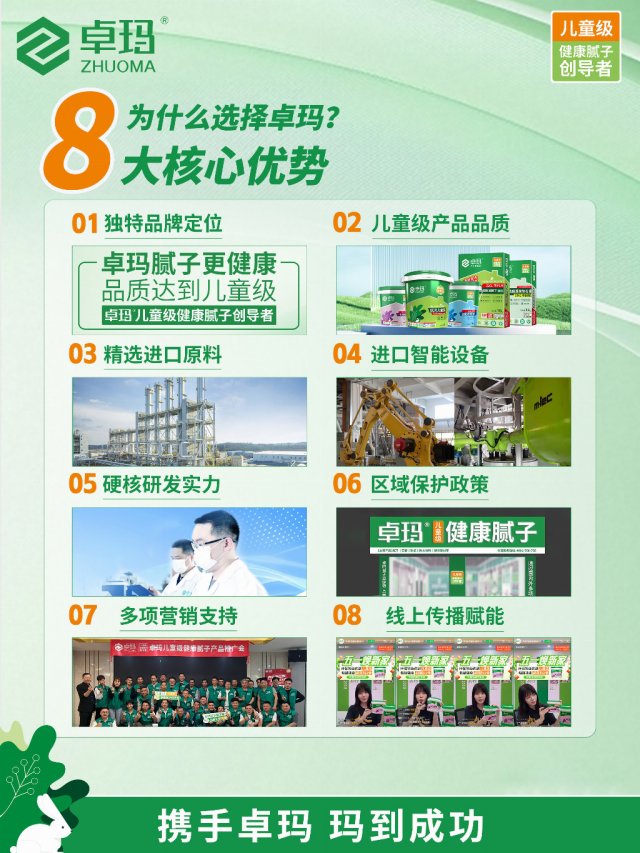 随着消费者对家居环境健康和品质的要求越来越高,卓玛儿童级健康腻子凭借其卓越的产品性能和创新的营销理念,必将在激烈的市场竞争中脱颖而出,成为更多家庭装修的首选品牌。卓玛儿童级健康腻子在市场上的影响力不断扩大,卓玛也在积极拓展招商渠道,吸引更多合作伙伴加入,共同开拓市场。卓玛为加盟商提供全方位的支持,包括品牌授权、市场推广、产品培训、售后服务等,帮助加盟商快速打开市场,实现盈利。