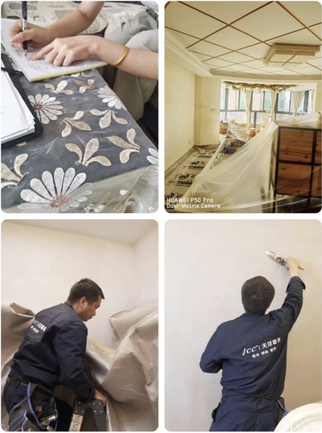 天洋墙布不用调胶、刷胶,师傅带工具上门,直接加热熨贴,没粉尘也没异味;