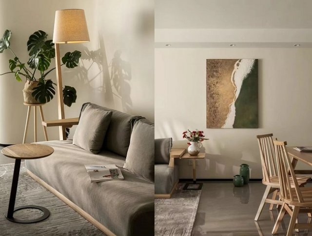 秋日的气息,总是与天然材质密不可分。一张原木沙发、桌椅等,其细腻纹理与暖木色交织,为整个空间奠定温暖基调,搭配棉麻坐垫、清新绿植,轻松打造出一片松弛安然的生活场域,让整个时空都“慢”下来。