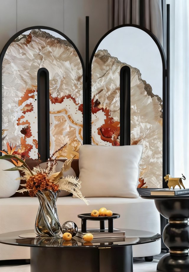 大胆运用装饰性极强的单品点缀空间,给人以眼前一亮的惊喜。如一扇枫叶主题的珐琅彩屏风,不仅是绝佳的空间隔断,更是堪比艺术品的视觉焦点,让绚烂秋色在空间中自然漫开。