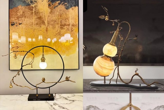 若更偏爱新中式,不妨选择充满东方美的艺术铜灯。黄铜材质温润质朴,与秋日氛围相得益彰,搭配以自然生态为素材的独特造型,在视觉上更具吸引力,摆在柜面、床头等,照亮一隅诗意。