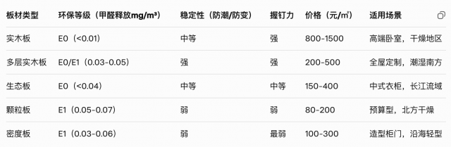 从表中可见,多层实木板在环保与实用间的平衡最佳,综合得分最高。 若预算允许,优先E0级多层板;经济型则选优质颗粒板。