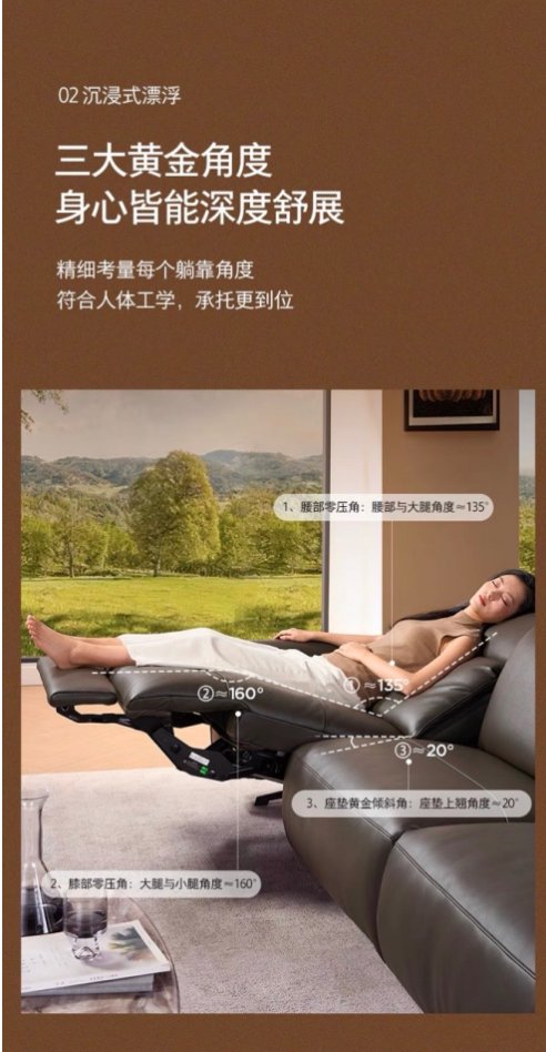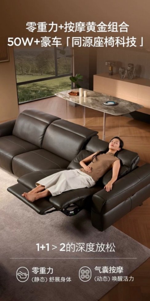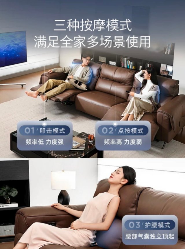 除了舒展零重力体验外,沙发还配置3段式气囊按摩功能,可精准覆盖腰背部等关键部位,通过轻柔且有节奏的按压,缓解肌肉紧绷感,唤醒身体活力;气囊按摩与舒展零重力体验深度协同,让身体放松与能量焕活同步发生,打造身心同频的居家舒适感。